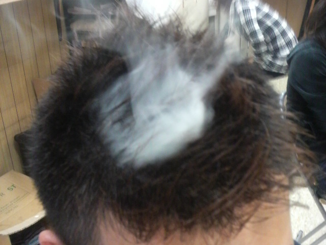 助っ人気づかず山盛り頭から大噴火☆全~然消えない煙に“ボス”大喜び♪